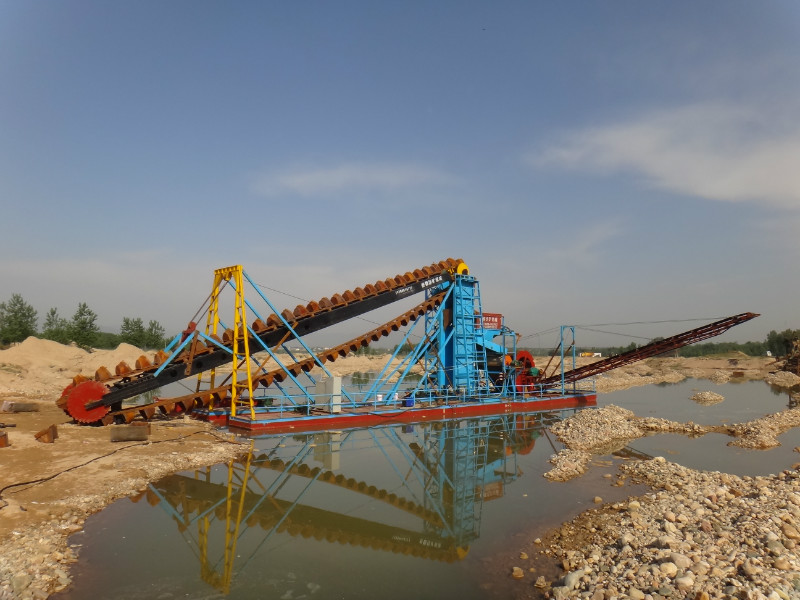 鏈斗式挖沙水洗船的船體使用拼裝式箱型結構,在配有挖掘裝置、篩選裝置、提升裝置、傳送裝置等裝置。鏈斗式挖沙船利用電機驅動挖斗上料。鏈斗式挖沙水洗船在實現河沙的挖掘水洗篩分的過程之后,可以通過揚沙泵或者輸送帶將河沙輸送到岸上。