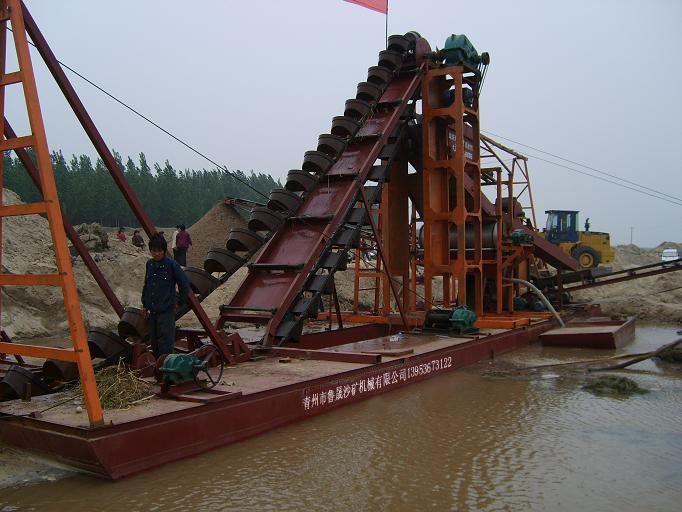該船挖深:3-28米,船長:14-30米,產量:60-120立方米/小時,動力:30-120千瓦,篩沙用振動篩或滾動篩,磁選提取方式單磁選外,可加雙磁選機。 本船為非自航(可定制自航)、鏈斗式挖砂選鐵船,船體采用橫骨架式分體箱形結構,裝有定位錨設備及鏈斗驅動設備,由安裝在船體上的絞車升降橋架,通過鏈斗裝置把水下的礦砂挖上來,然后進入圓篩進行分離,再次經加水稀釋、漂洗的砂漿均勻的給到磁選筒表面具有高磁力的選別區,經沖洗水沖掉附帶的河沙后被輸送到礦區,磁性礦由水流沖到鐵砂收集箱,成為高品位的鐵砂,而非磁性鐵則不受磁力作用直接進入尾礦槽排出,由此達到提取鐵粉的目的,動力由發電機組發電驅動。  回收鐵粉的同時可以回收黃金,可以將沙子輸送到岸邊。這都是可以根據客戶的要求來設計選型的。