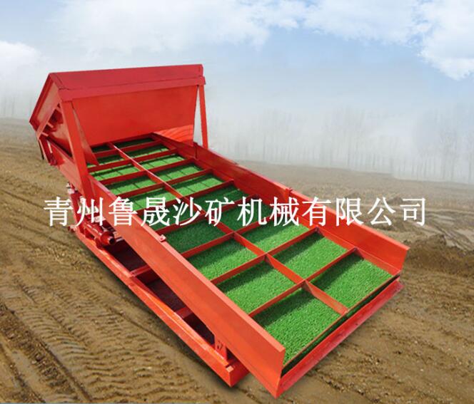 通過人工或者小型挖掘機將料上至料斗內(nèi),料斗內(nèi)有噴水裝置,料斗底板為傾斜式。礦料流淌流暢、均勻。礦料進入精選槽格眼處和格邊處形成一個相對負壓的狀態(tài),對礦料有一個“吸”的作用,金被強制吸入,進入相對平靜的格板下層內(nèi),經(jīng)過蠕動的作用格板內(nèi)的沙料是很疏松的,不會出現(xiàn)普通溜槽的板結現(xiàn)象。