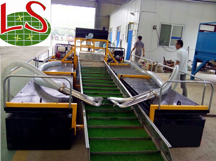 以前回收一般是采用浮選、氫化、堆浸等工藝進行黃金回收,但是這些工藝都有缺點,一是污染嚴重,二是浮選很多包裹的顆粒金收不住。所以現(xiàn)在使用比較廣泛的是重選法。采用重選設備將黃金進行回收,重選設備有很多優(yōu)點,比如沒有污染,另外重選設備有很多種可以根據(jù)礦料不同的情況來進行并聯(lián)使用。比如回收顆粒金的光用來回收顆粒金,回收毛金、片金的光用來回收這兩種形態(tài)的。魯晟機械生產(chǎn)的尾礦重選設備,現(xiàn)在在多個礦區(qū)有所應用,是用來回收選礦廠尾礦的。砂泵采金船